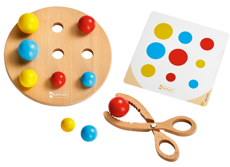 Mit der großen Holzschere werden die bunten Bälle auf dem Spielbrett in eine bestimmte Position gebracht, wie auf den Arbeitskarten vorgeschlagen. Die Kugeln unterscheiden sich durch ihre Farbe und ihren Durchmesser. Die 6 doppelseitigen Karten bieten 12 Aktivitäten, die in zwei Schwierigkeitsgraden organisiert sind.
